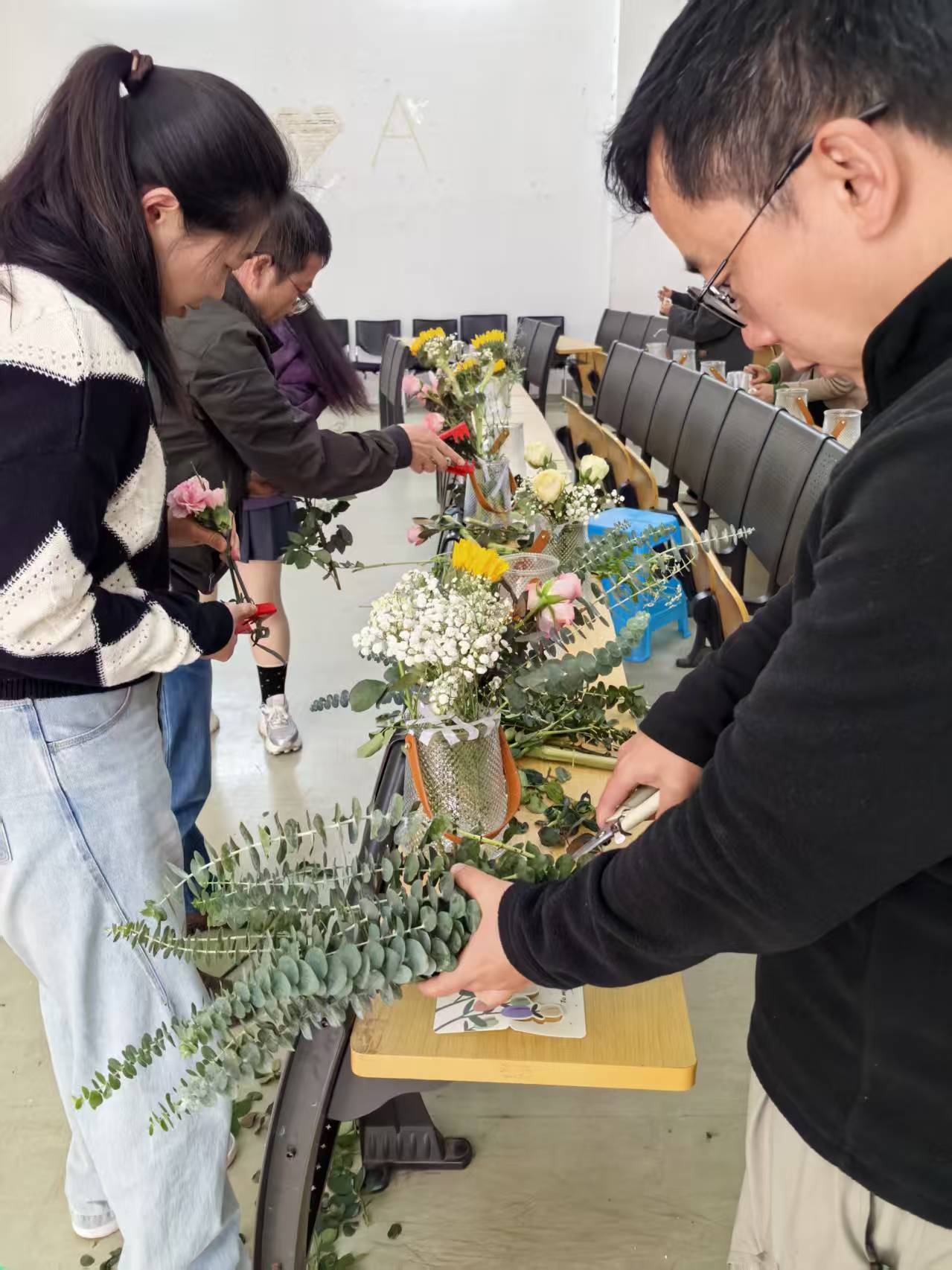 活动尾声,老师们手捧专属花艺作品合影留念,笑脸与鲜花相映成趣,定格下温暖治愈的动人瞬间。此次插花活动,不仅为教职工搭建了放松身心、展示才情的优质平台,更拉近了彼此距离,进一步增强了教职工队伍的凝聚力、向心力与归属感,让大家真切感受到学院大家庭的温情关怀。