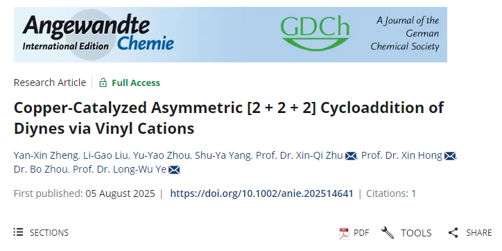 近日,云南省现代分离分析与物质转化重点实验室、云南师范大学化学化工学院朱欣祺研究员与柔性引进高层次人才叶龙武教授合作,在化学领域国际顶级期刊《Angewandte Chemie International Edition》(德国应用化学,2025年影响因子16.9)上发表了题为“Copper-Catalyzed Asymmetric [2+2+2] Cycloaddition of Diynes via Vinyl Cations”的最新研究成果。朱欣祺研究员为论文第一通讯作者,厦门大学叶龙武教授为共同通讯作者。《德国应用化学》是国际化学、化工、材料领域具重要影响力的综合性刊物之一,自1888年创刊以来始终保持着化学领域的顶尖学术地位。