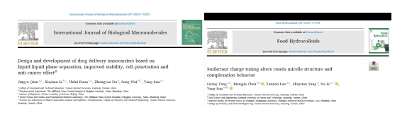 竞赛成果进一步转化为学术论文,学生团队以第一作者身份在食品与生物材料领域期刊Food Hydrocolloids(中科院一区TOP,影响因子12.4)与International Journal of Biological Macromolecules(中科院二区TOP,影响因子8.5)上发表SCI论文2篇,指导教师为应用化学系孙洋副教授和杜仲尧博士。